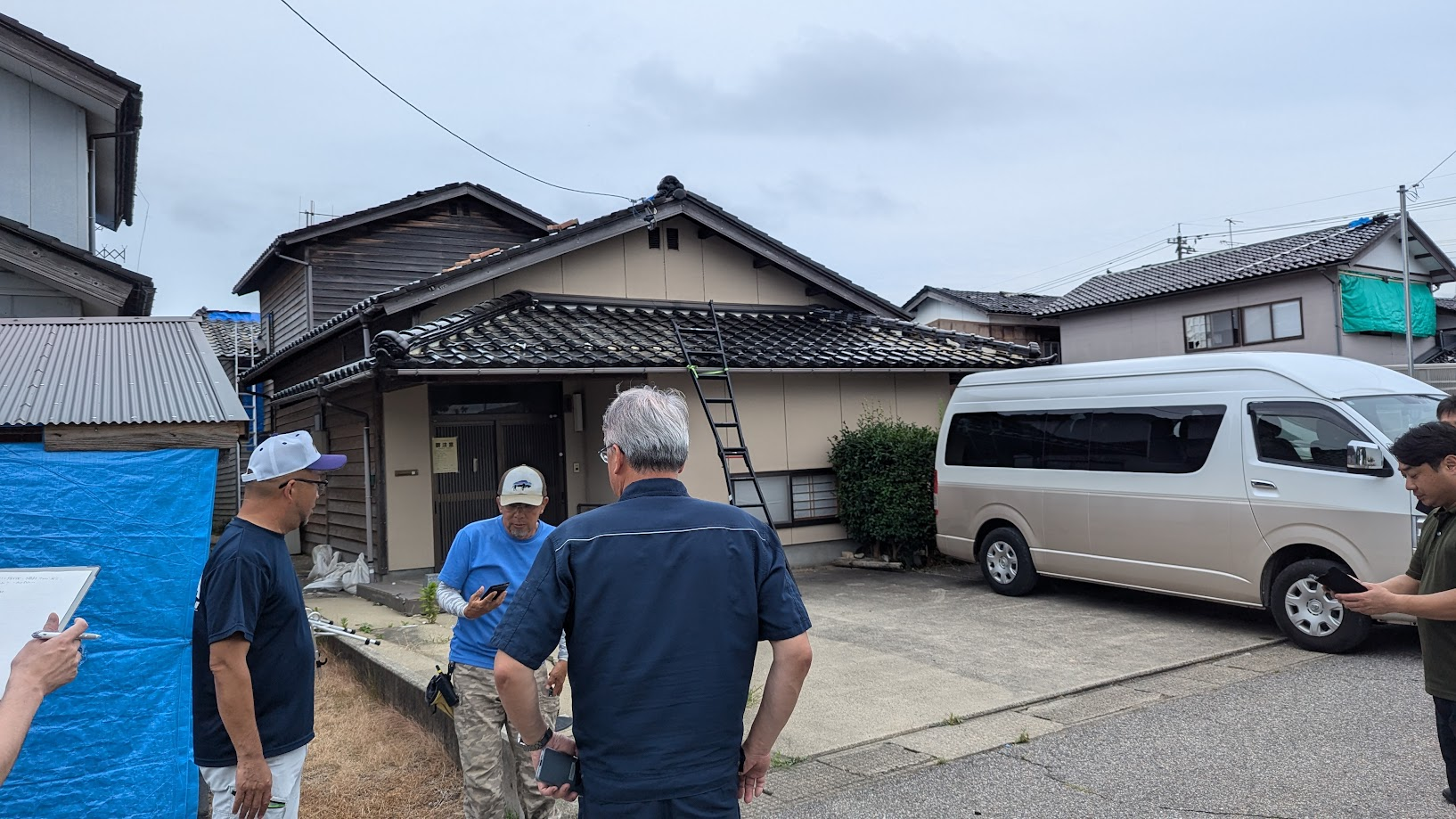 被災した家屋の屋根を修理している現場において、修理作業を行っている技術系ボランティアの方から作業の様子や、作業上の課題について話を伺った。屋根に落下防止用の命綱を設置する場所がないため、安全に命綱を固定するための器具などがあると助かるということで、意見交換を行った。