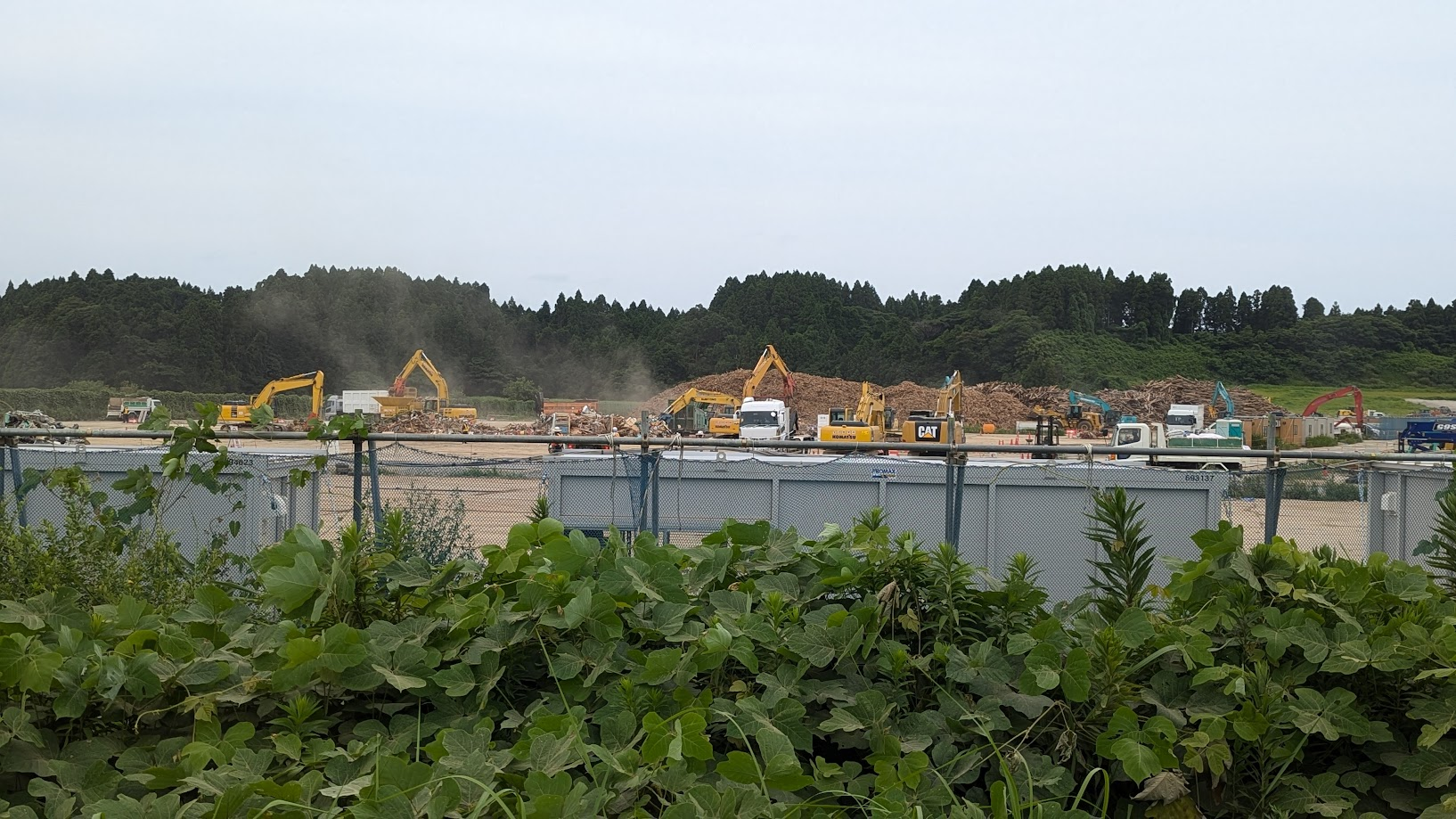 災害現場から運ばれてきたゴミが、仮置き場に種類ごとに分別されておかれていた。ダンプなどがひっきりなしに仮置き場に分別されたゴミを運んできていた。